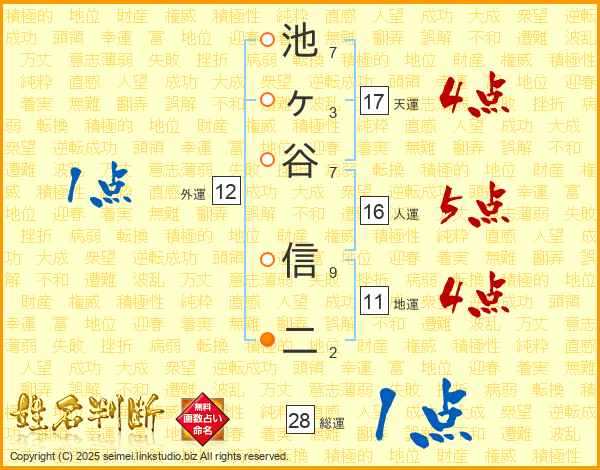 池(7画)ヶ(3画)谷(7画) 信(9画)二(2画)
