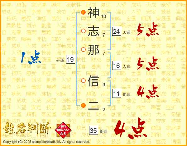 神(10画)志(7画)那(7画) 信(9画)二(2画)
