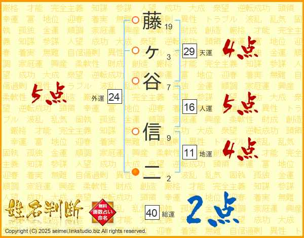 藤(19画)ヶ(3画)谷(7画) 信(9画)二(2画)