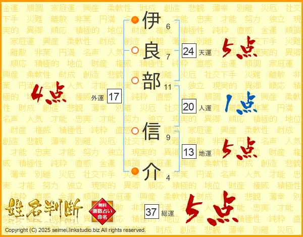 伊(6画)良(7画)部(11画) 信(9画)介(4画)