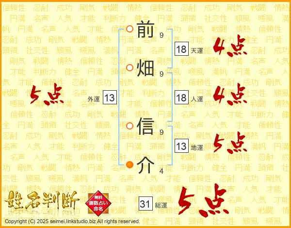 前(9画)畑(9画) 信(9画)介(4画)