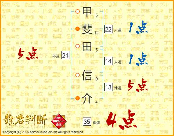 甲(5画)斐(12画)田(5画) 信(9画)介(4画)