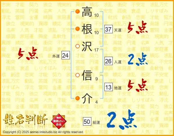 高(10画)根(10画)沢(17画) 信(9画)介(4画)