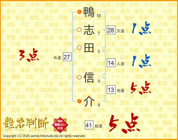 鴨(16画)志(7画)田(5画) 信(9画)介(4画)
