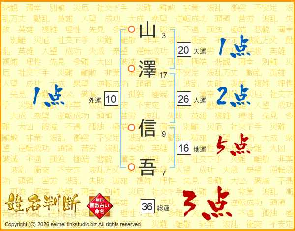 あなたの人生を表す1番重要な運勢です。生涯を通じて影響する総合運となり、主に50歳以降の晩年期に影響を及ぼします。苗字と名前の合計画数。