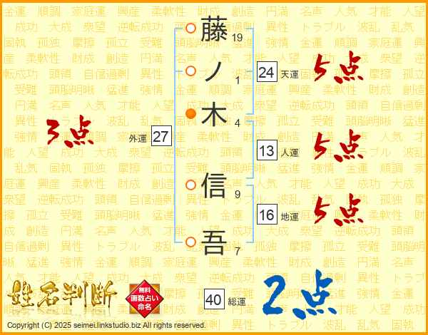 藤(19画)ノ(1画)木(4画) 信(9画)吾(7画)