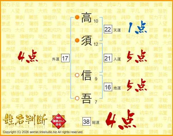 生活面を象徴する運勢です。外部から受ける影響力を表し、結婚運、家庭運や職場、環境への順応性を表します。総運から人運を引いた画数。姓や名が1文字の場合を除く。