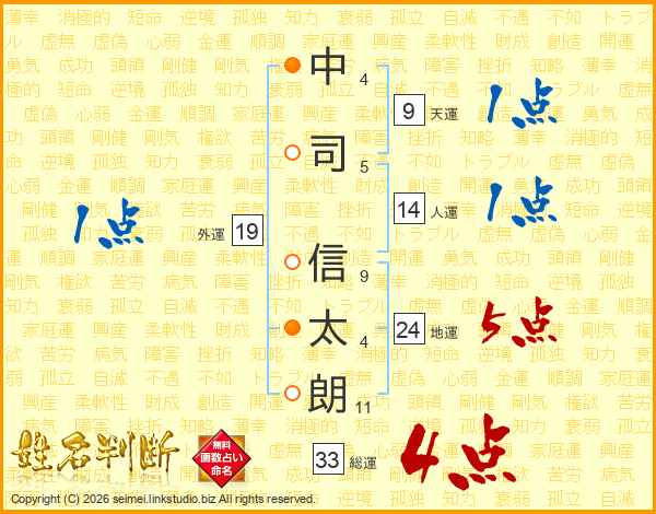 中(4画)司(5画) 信(9画)太(4画)朗(11画)