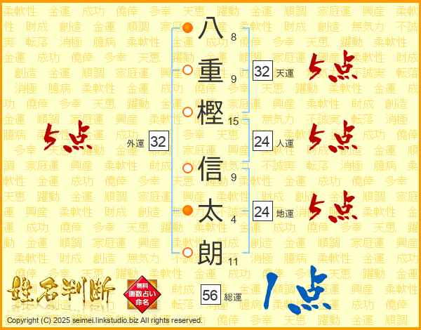 八(8画)重(9画)樫(15画) 信(9画)太(4画)朗(11画)