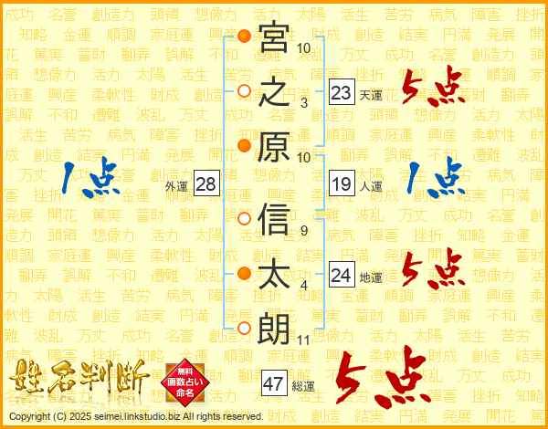 宮(10画)之(3画)原(10画) 信(9画)太(4画)朗(11画)