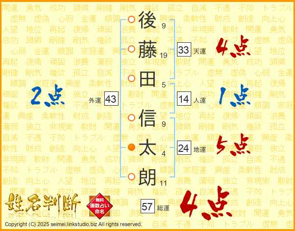 後(9画)藤(19画)田(5画) 信(9画)太(4画)朗(11画)