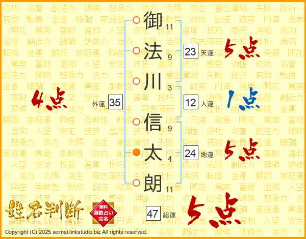 御(11画)法(9画)川(3画) 信(9画)太(4画)朗(11画)