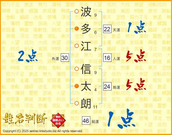 波(9画)多(6画)江(7画) 信(9画)太(4画)朗(11画)