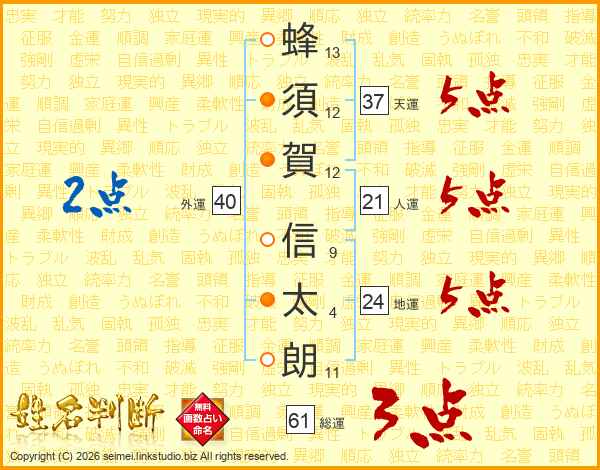 蜂(13画)須(12画)賀(12画) 信(9画)太(4画)朗(11画)