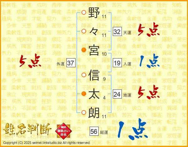 野(11画)々(11画)宮(10画) 信(9画)太(4画)朗(11画)