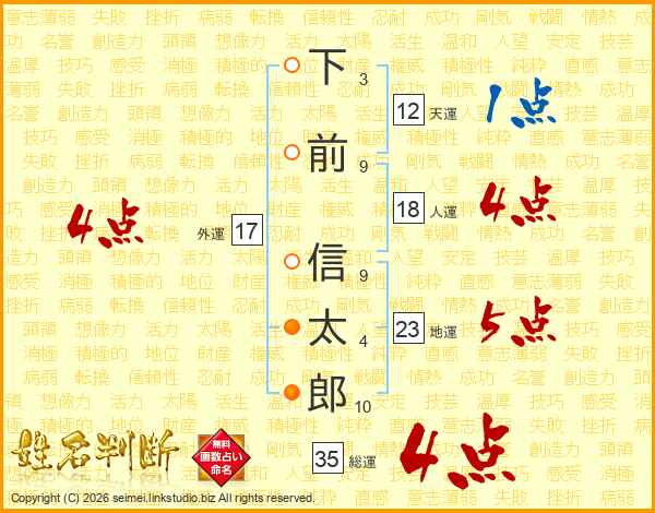 下(3画)前(9画) 信(9画)太(4画)郎(10画)
