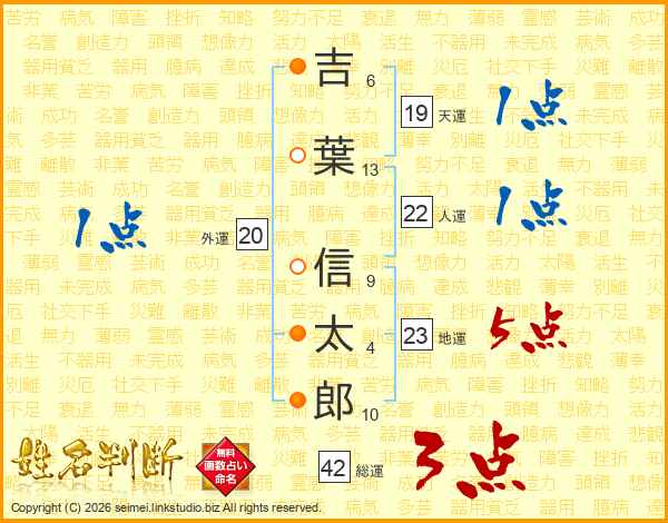 吉(6画)葉(13画) 信(9画)太(4画)郎(10画)