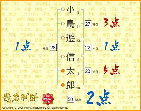 小(3画)鳥(11画)遊(13画) 信(9画)太(4画)郎(10画)