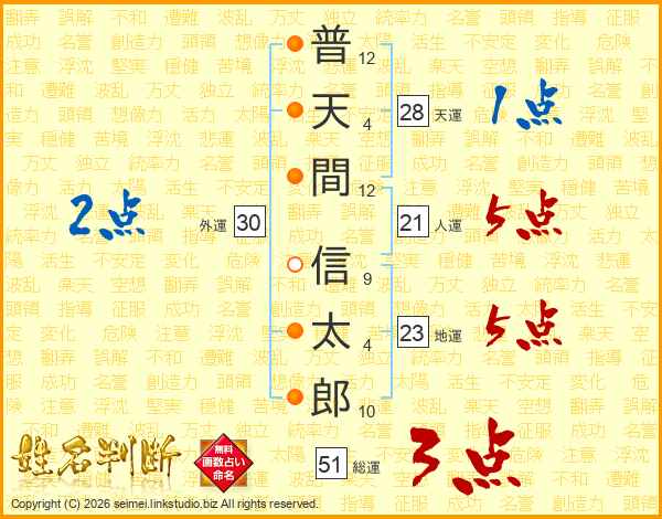 普(12画)天(4画)間(12画) 信(9画)太(4画)郎(10画)