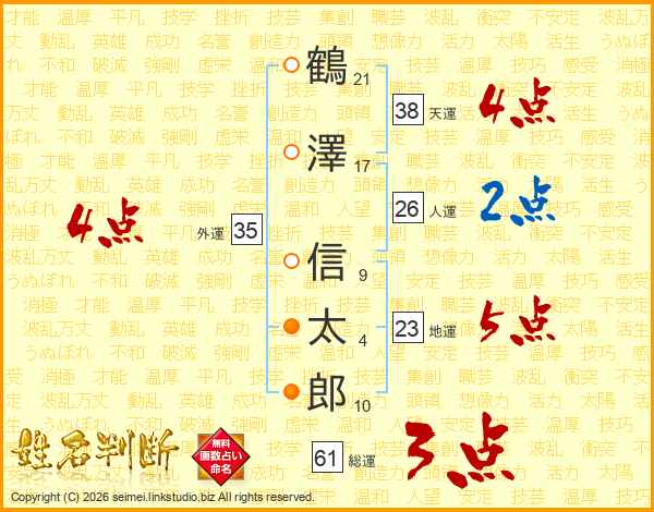 鶴(21画)澤(17画) 信(9画)太(4画)郎(10画)