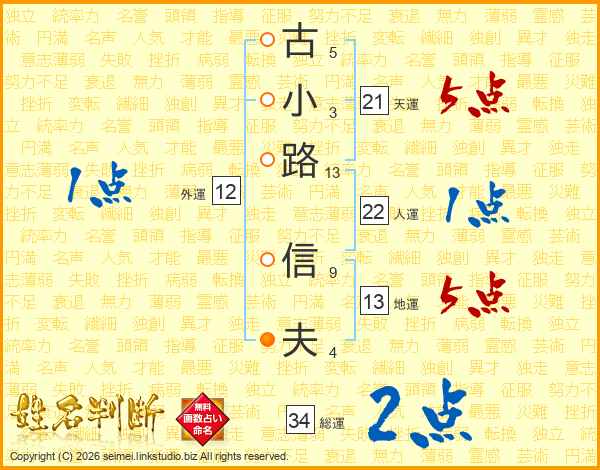 古(5画)小(3画)路(13画) 信(9画)夫(4画)