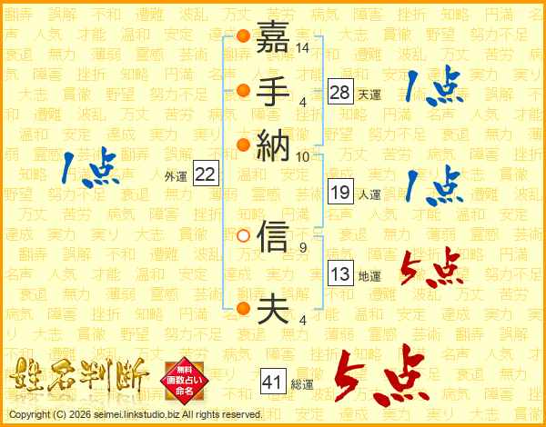 嘉(14画)手(4画)納(10画) 信(9画)夫(4画)