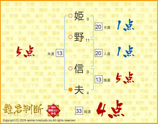 画数の奇数(○陽)と偶数(●陰)の配列で吉凶を占います。どちらかにかたよる名前は大凶名で避ける必要があります。画数の奇数偶数。