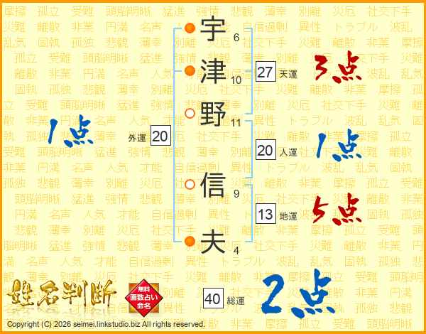 宇(6画)津(10画)野(11画) 信(9画)夫(4画)
