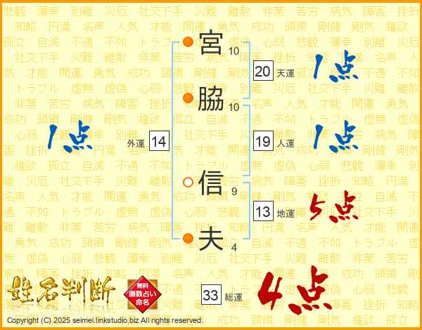 宮(10画)脇(10画) 信(9画)夫(4画)