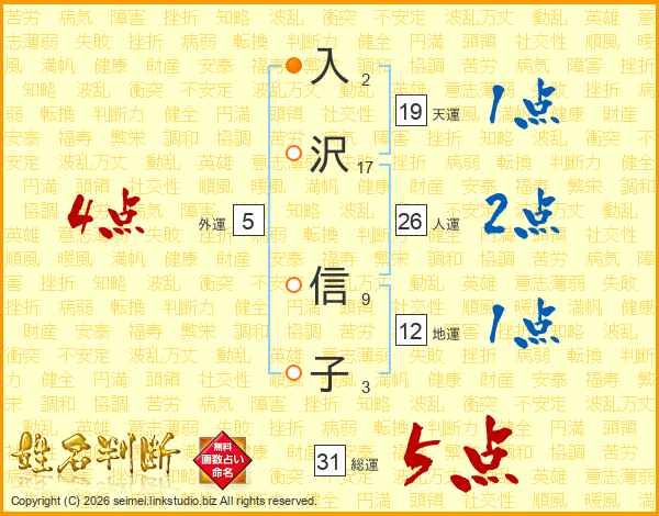 生活面を象徴する運勢です。外部から受ける影響力を表し、結婚運、家庭運や職場、環境への順応性を表します。総運から人運を引いた画数。姓や名が1文字の場合を除く。