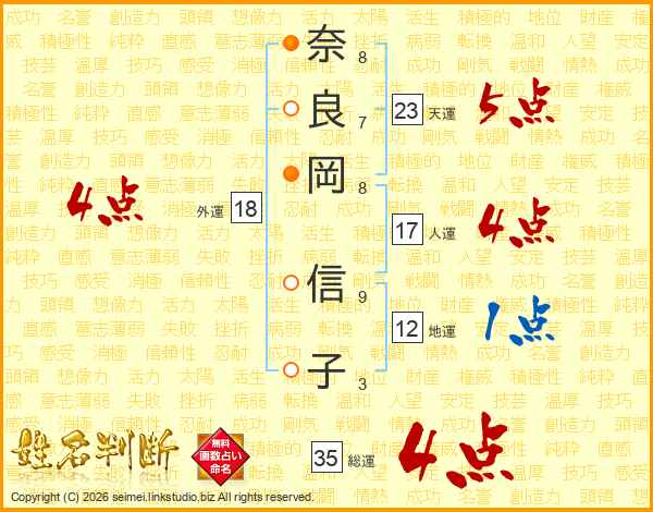 奈(8画)良(7画)岡(8画) 信(9画)子(3画)