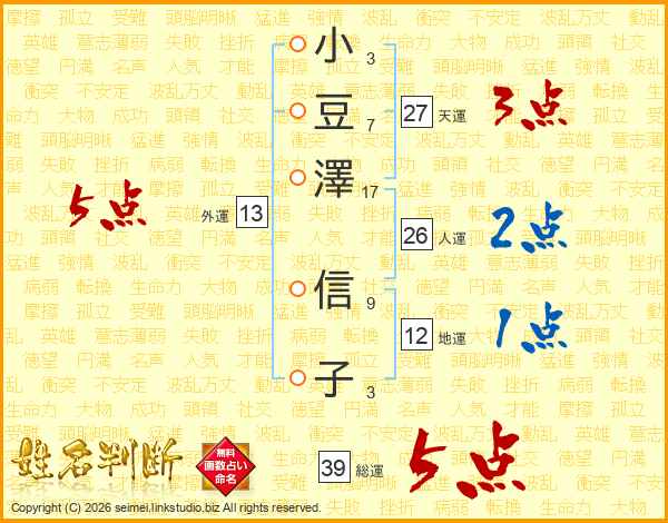 小(3画)豆(7画)澤(17画) 信(9画)子(3画)