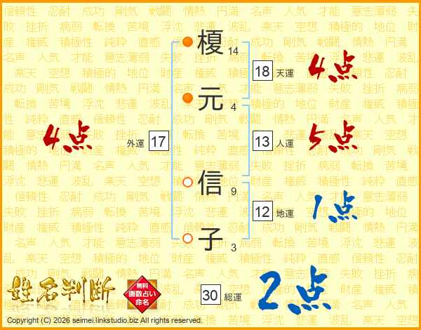 あなたの人生を表す1番重要な運勢です。生涯を通じて影響する総合運となり、主に50歳以降の晩年期に影響を及ぼします。苗字と名前の合計画数。