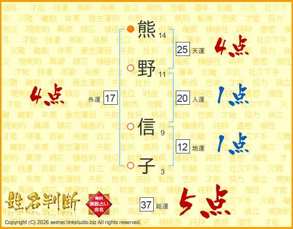 熊野信子さんの総運は37画の5点!