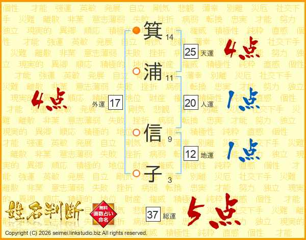 生活面を象徴する運勢です。外部から受ける影響力を表し、結婚運、家庭運や職場、環境への順応性を表します。総運から人運を引いた画数。姓や名が1文字の場合を除く。