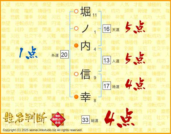 堀(11画)ノ(1画)内(4画) 信(9画)幸(8画)