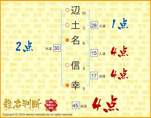 辺(19画)土(3画)名(6画) 信(9画)幸(8画)