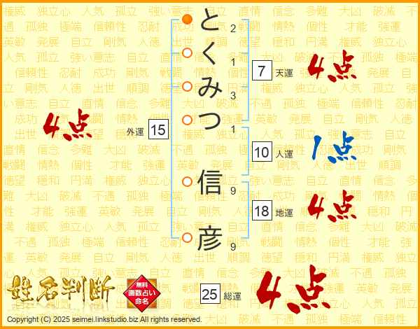 と(2画)く(1画)み(3画)つ(1画) 信(9画)彦(9画)