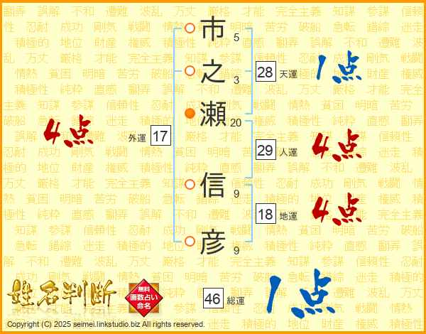市(5画)之(3画)瀬(20画) 信(9画)彦(9画)