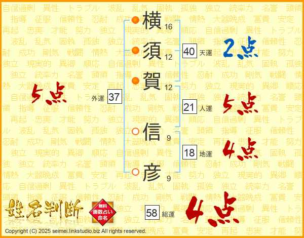 横(16画)須(12画)賀(12画) 信(9画)彦(9画)