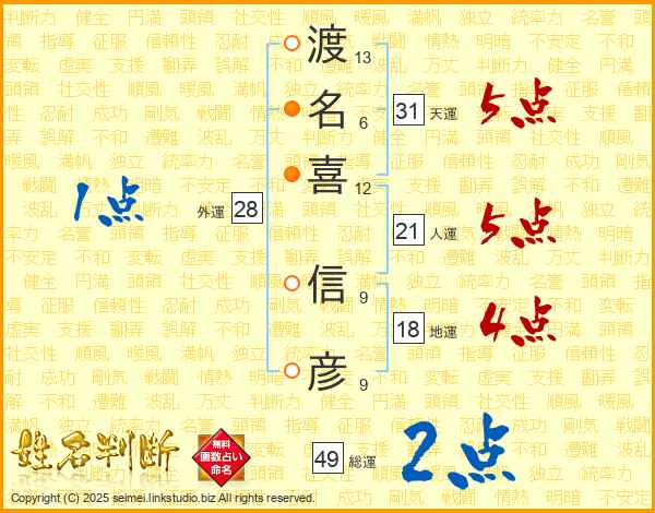 渡(13画)名(6画)喜(12画) 信(9画)彦(9画)