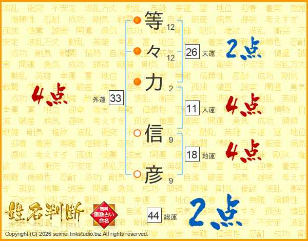 等(12画)々(12画)力(2画) 信(9画)彦(9画)