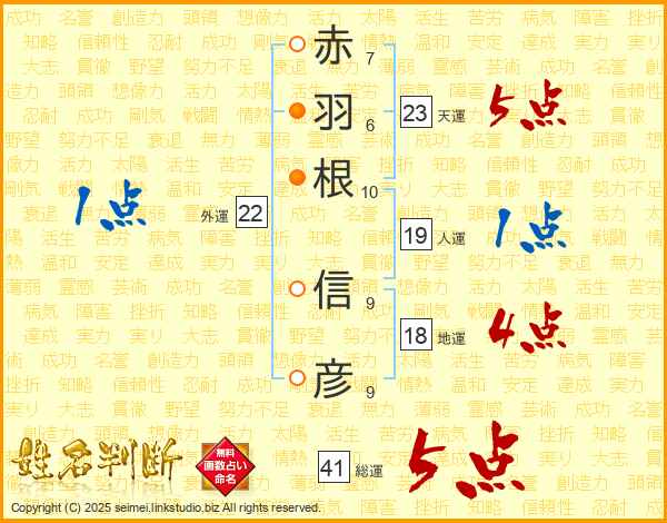赤(7画)羽(6画)根(10画) 信(9画)彦(9画)