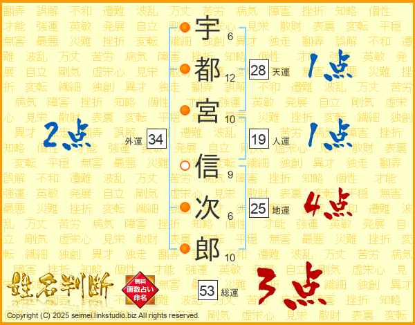 宇(6画)都(12画)宮(10画) 信(9画)次(6画)郎(10画)