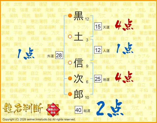 黒(12画)土(3画) 信(9画)次(6画)郎(10画)