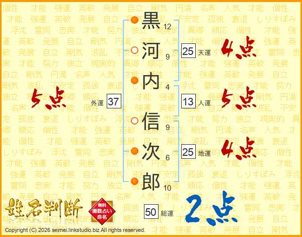 黒(12画)河(9画)内(4画) 信(9画)次(6画)郎(10画)