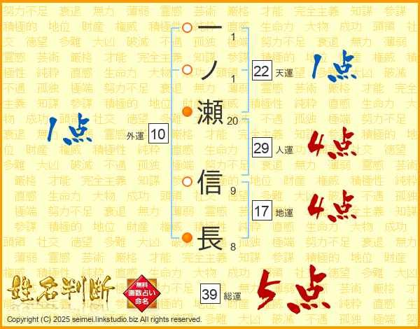 一(1画)ノ(1画)瀬(20画) 信(9画)長(8画)