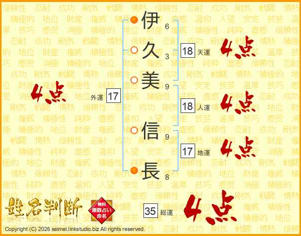 伊(6画)久(3画)美(9画) 信(9画)長(8画)