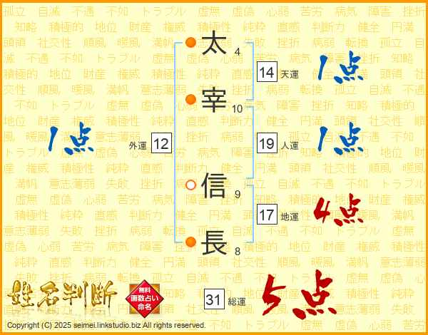 生活面を象徴する運勢です。外部から受ける影響力を表し、結婚運、家庭運や職場、環境への順応性を表します。総運から人運を引いた画数。姓や名が1文字の場合を除く。