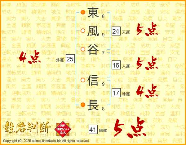 東(8画)風(9画)谷(7画) 信(9画)長(8画)